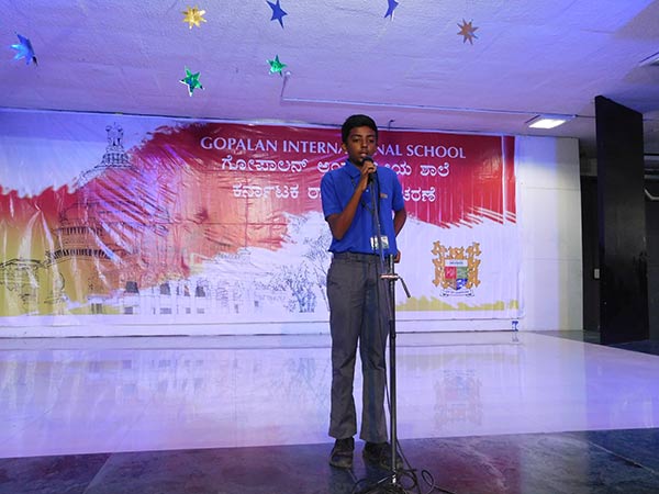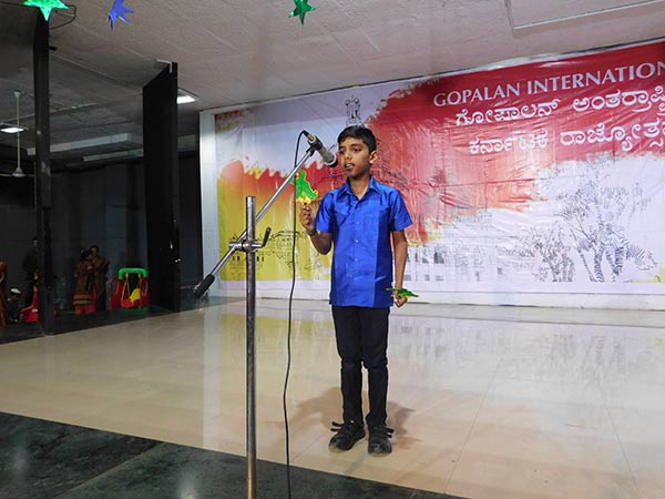 62 Kannada Rajyotsava was celebrated with great enthusiasm on October 31st in Gopalan International School. Students spoke about the birth of Karnataka and Kannada language very effectively in Kannada . Kannada students also sang Karnataka naadageethe "Jai Bhaaratha jananiya tanujaathe " and performed a skit 'Keliddu sullaagabahudu". The program touched everyone's heart. On the occasion of this event, Kannada teachers conducted story narration ,handwriting, elocution and poem recitation competition for Kannada students of 1-10th grades.
