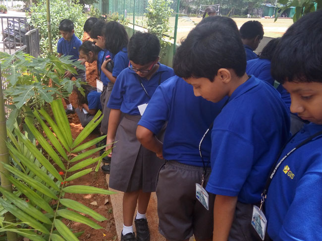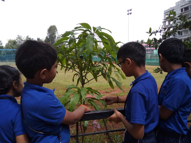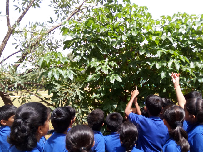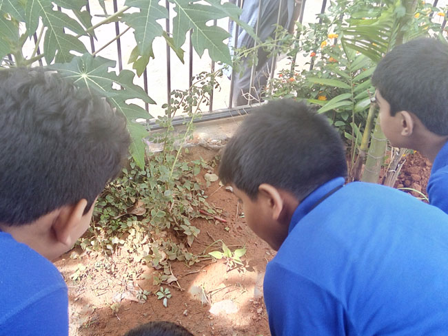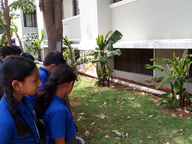 As a part of their science activity, students of class IV visited the school garden, to learn more about living and non-living things. They observed the various plants and trees in our school garden like the banana tree, jamun tree, gulmohar tree, bamboo tree, palm tree, beetle nut tree, gooseberry, lemon, chikoo and mango sapling. They also observed various flowering and non flowering plants. Along with plants they also observed various types of insects and animals. Seeing a Chameleon camouflaging on a tree bark, smelling the fresh mango leaf, touching the touch me not plant, discovering leaf cutter bees, listening to the sound of the moving air and rustling of leaves were few things that they really appreciated.
