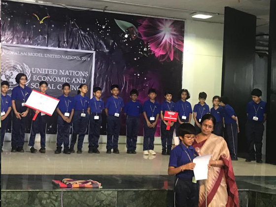 Trophies and certificates for the achievers were distributed. A note on Dhyan Chand, whose birthday is celebrated as National Sports Day was read by a student of III - C - Diganth Patil.